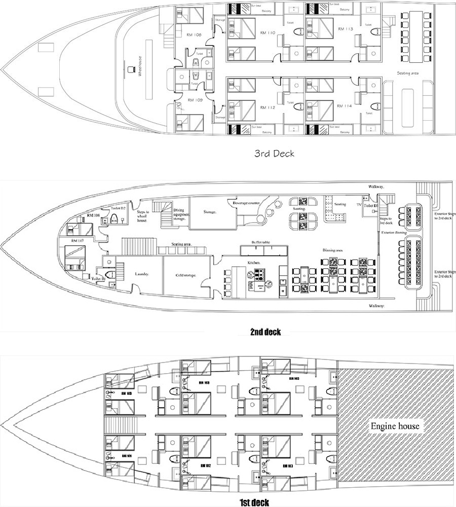 Lower Deck: 4 Standard Rooms each with 1 double bed +1 single bed