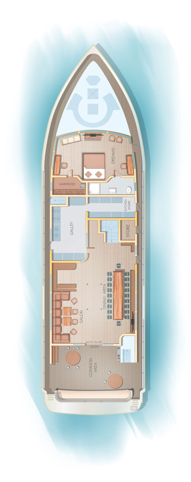 Located on the upper deck, the cabin makes you feel inspired with its interior which consists of a comfortable double bed and two wardrobes.