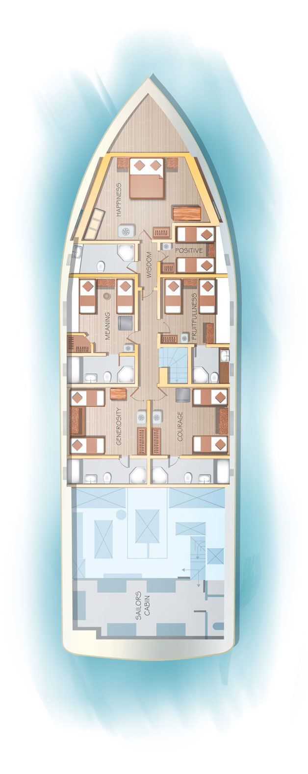 Spacious and well thought-out, the “Meaning” cabin is located on the lower deck on the port side. There is a spacious corner wardrobe, two comfortable beds, and a private bathroom in the cabin. Where else should you look for the meaning of life, if not aboard a dazzling yacht in the middle of the turquoise ocean, in a stylish cabin?