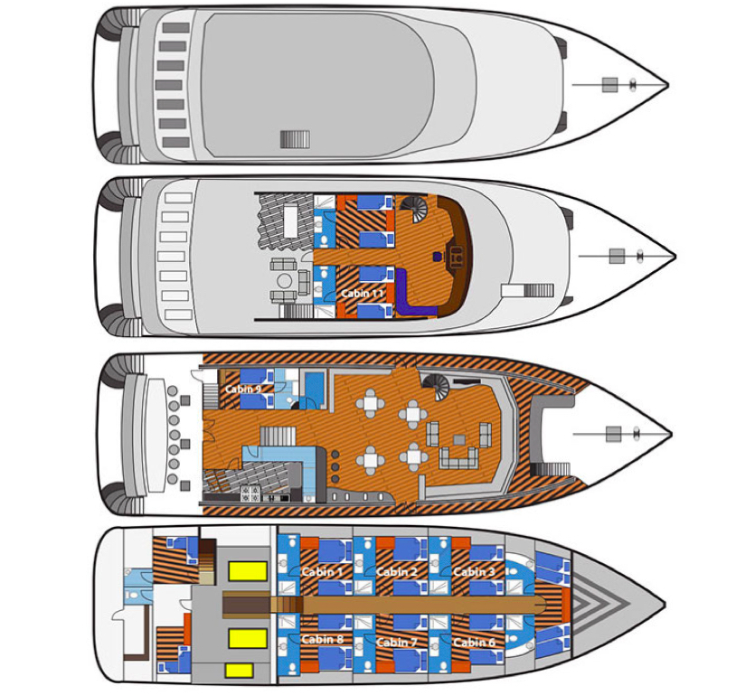 The indoor saloon has a bar offering a wide choice of soft drinks and spirits, a TV-DVD-Stereo area furnished with comfortable sofas . All yacht furniture is made of valuable Maldivian wood. Recharging area for cameras 220v electricity.