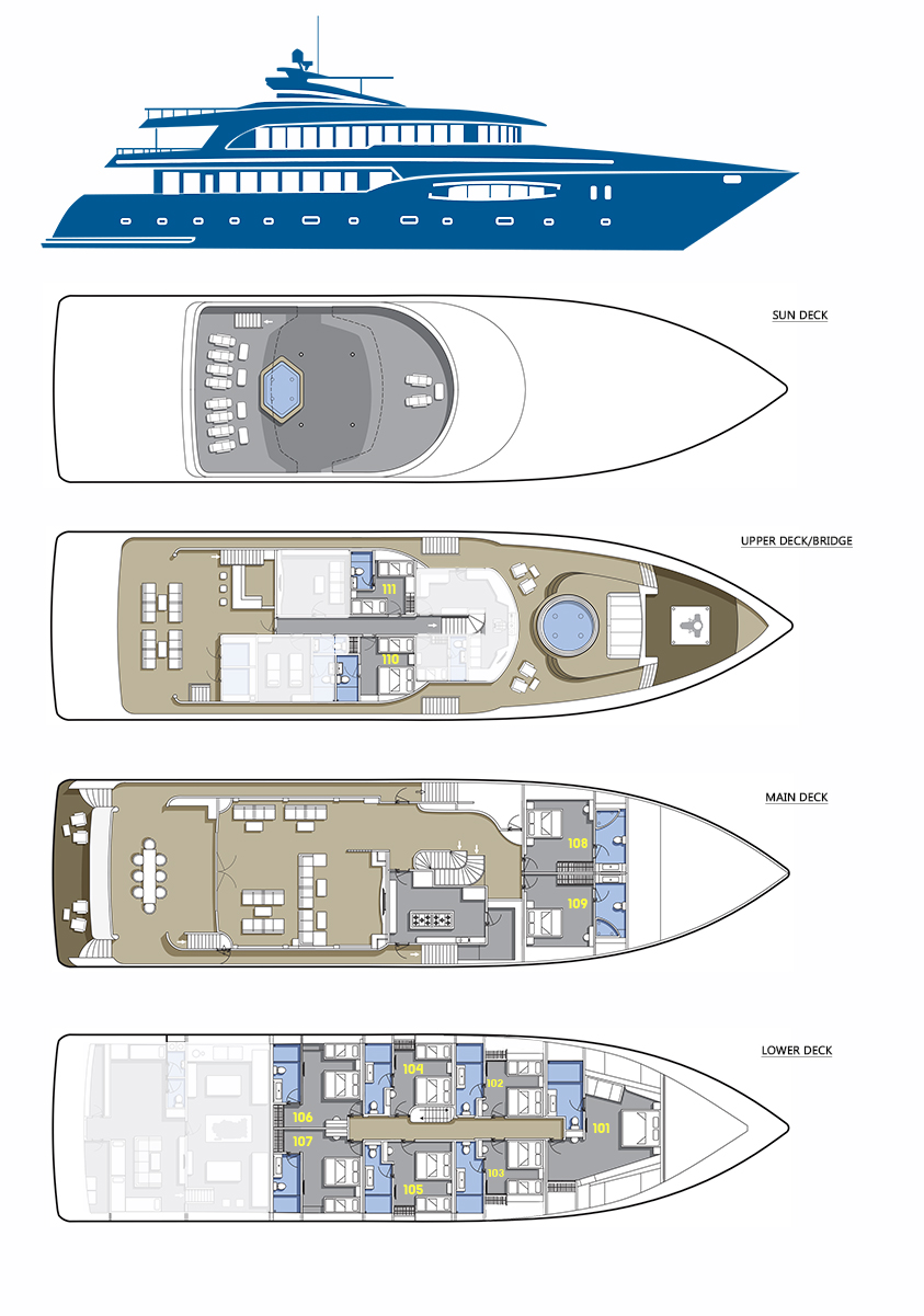 12 excellent cabins for 24 people, 7 wide double cabins, 2 Junior Suites, 1 Master Cabin and 2 Master suites.