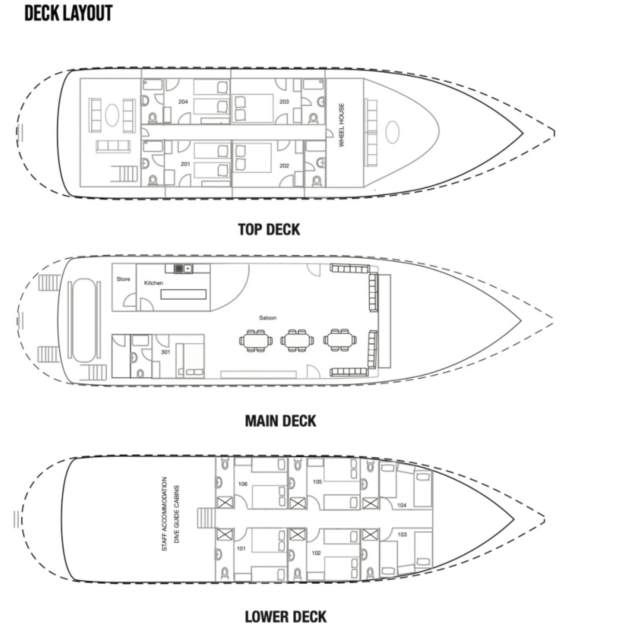 The liveabaord consists of a spacious saloon area & a restaurant all with modern wooden furniture. The exterior relaxation areas are ample with one at the back of the main deck, front of the main deck and back of the upper deck. The liveaboard also has a spacious sun deck equipped with a jacuzzi.