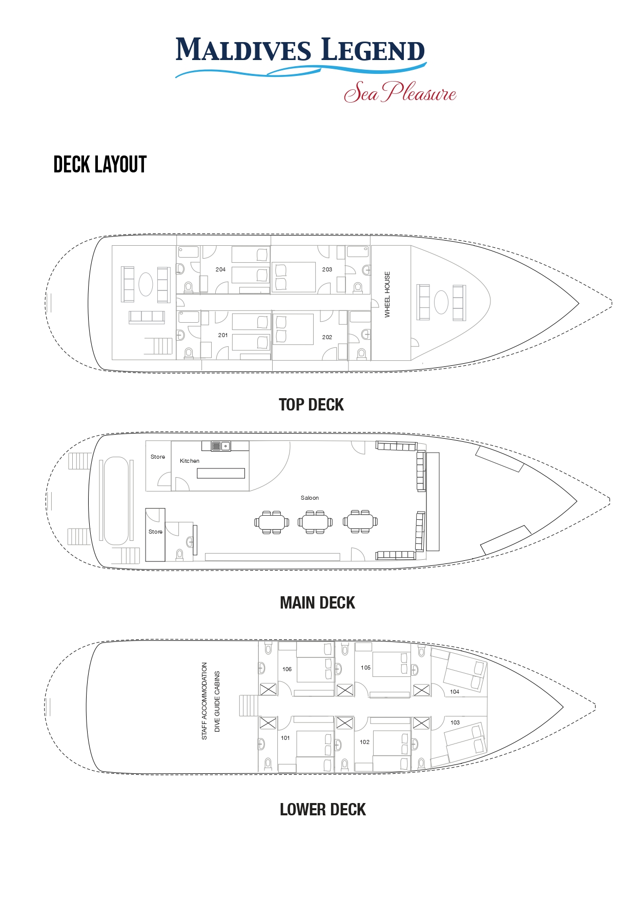 The beautifully designed and luxuriously furnished liveaboard, Maldives Legend - Sea Pleasure is crafted with passion and exquisitely built for the elite customers. The magnificent and beautiful Maldives Legend – Sea Pleasure is a 30 metre luxury liveaboard. This elegant and beautiful yacht was built in Maldives with passion and love and crafted for for both private charters and dive trips. Built with attention to detail for the seas of Maldives, the vessel comprises of a total of four decks. The liveaboard could accommodate a total of 20 pax in 10 cabins.