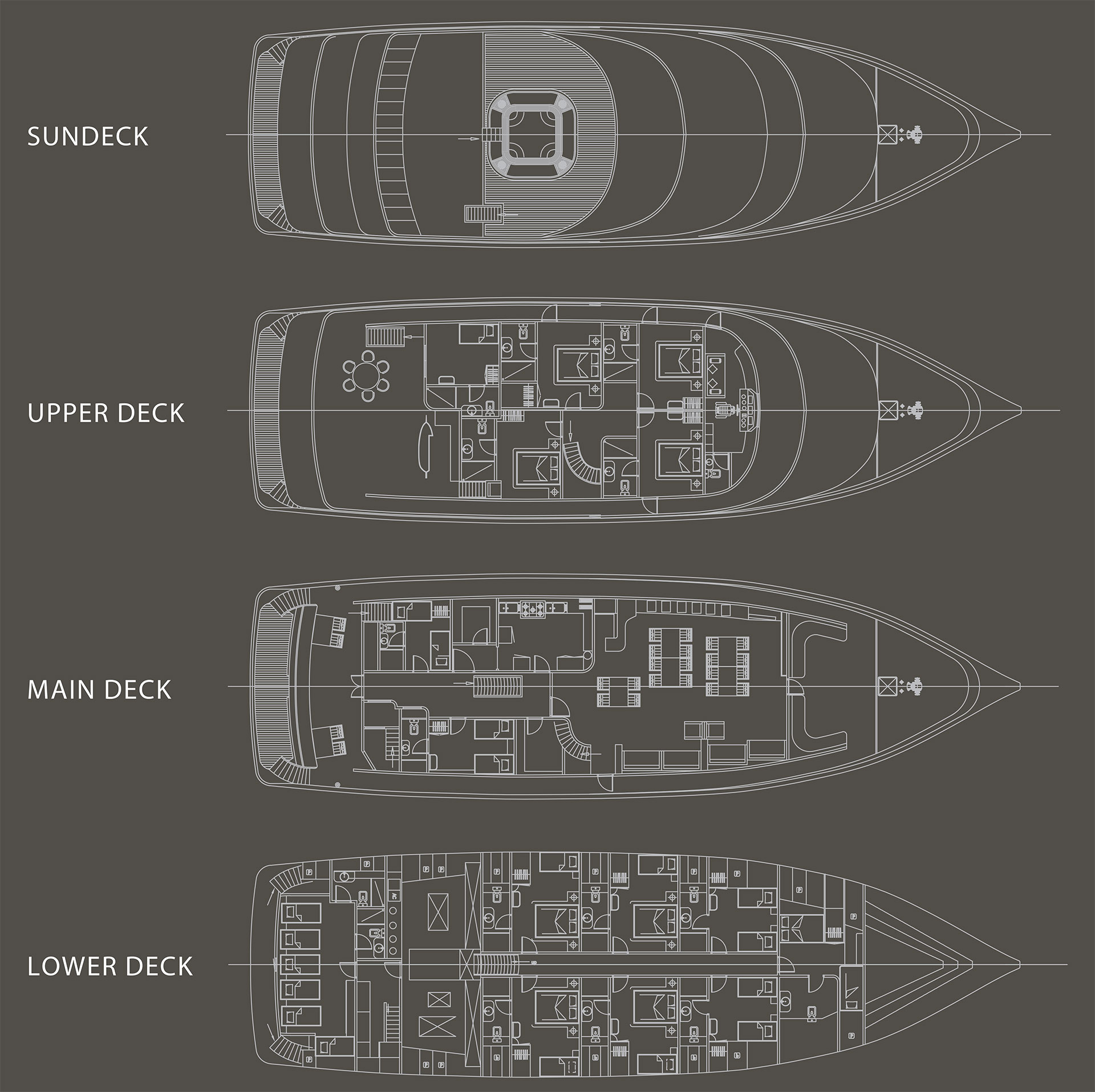 The lower deck houses 7 twin rooms, that can be converted to double rooms, the main deck houses the restaurant, and the top deck – 4 rooms each with double beds and a bathtub. Sprawled on the sun deck lies a Jacuzzi large enough to accommodate 6 people, and showers. The restaurant welcomes you with a buffet of both international and of local flavors and can accommodate 22pax at a time, and the bar will be ready to fix you the cocktail of your choice.