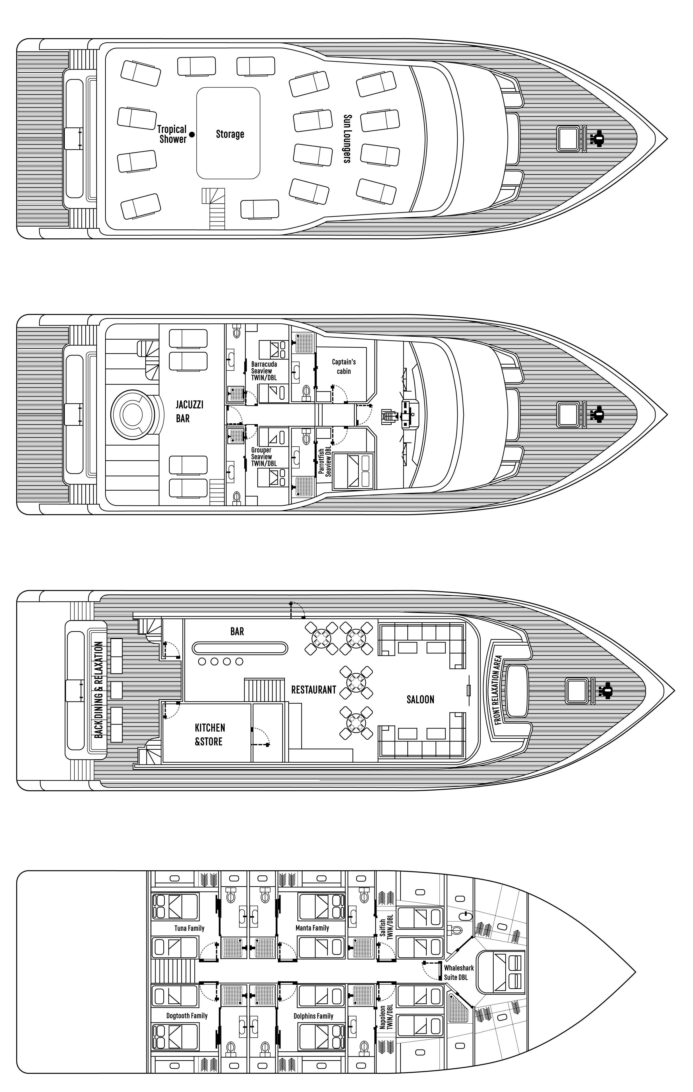 There are 3 seaview suites, all of which are located on the upper deck. Guests can choose to opt for either twin or double accommodations.