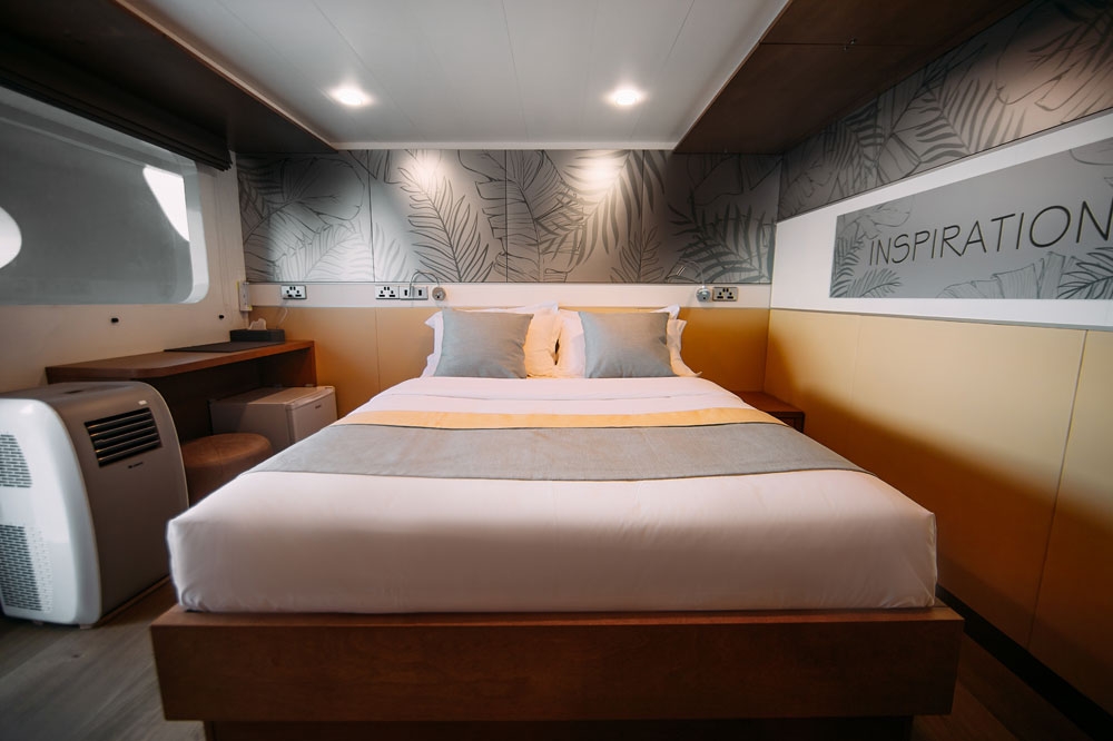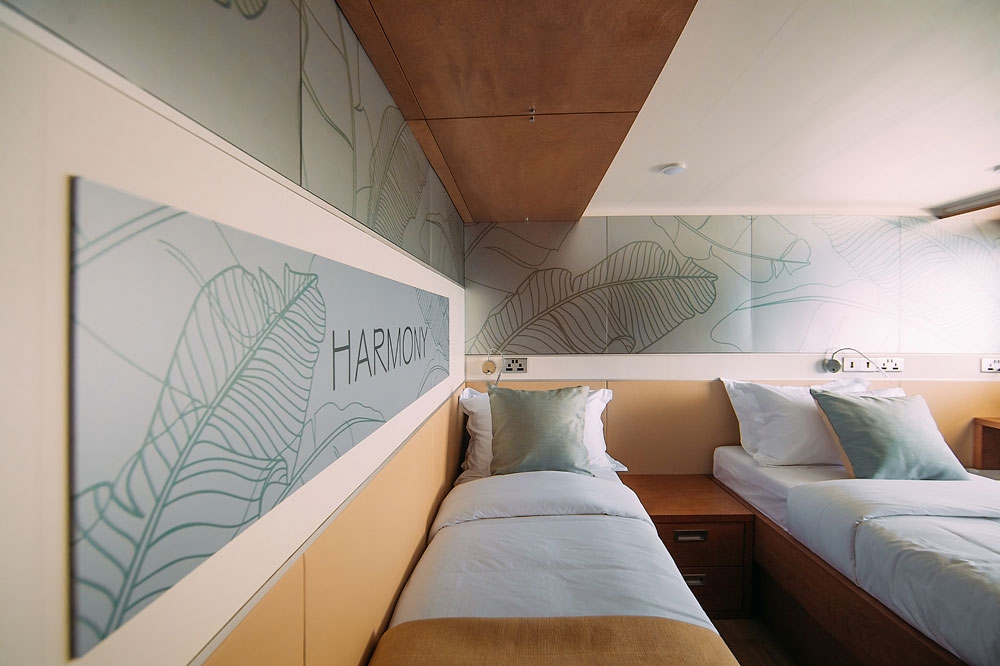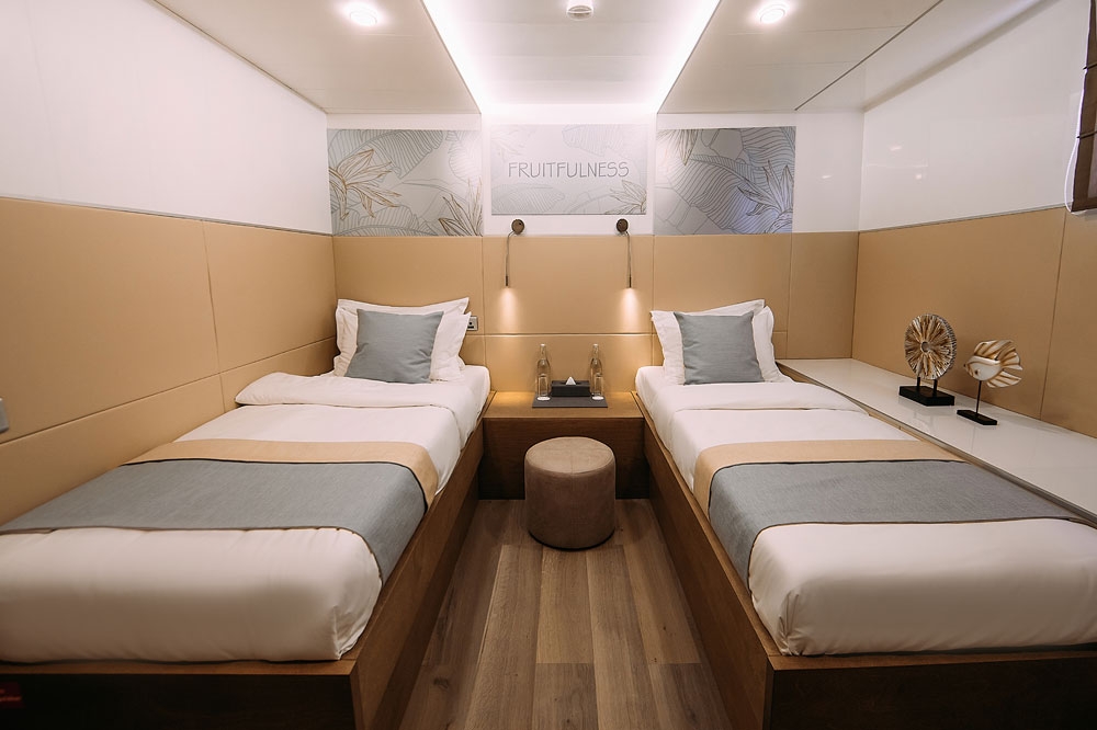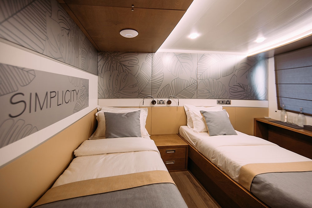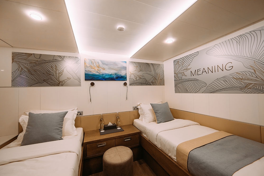 Located on the lower deck, the cabin is generous with its voluminous space while accommodating two beds. The convenience and comfort provided by the cabin are akin to any room in a boutique hotel.