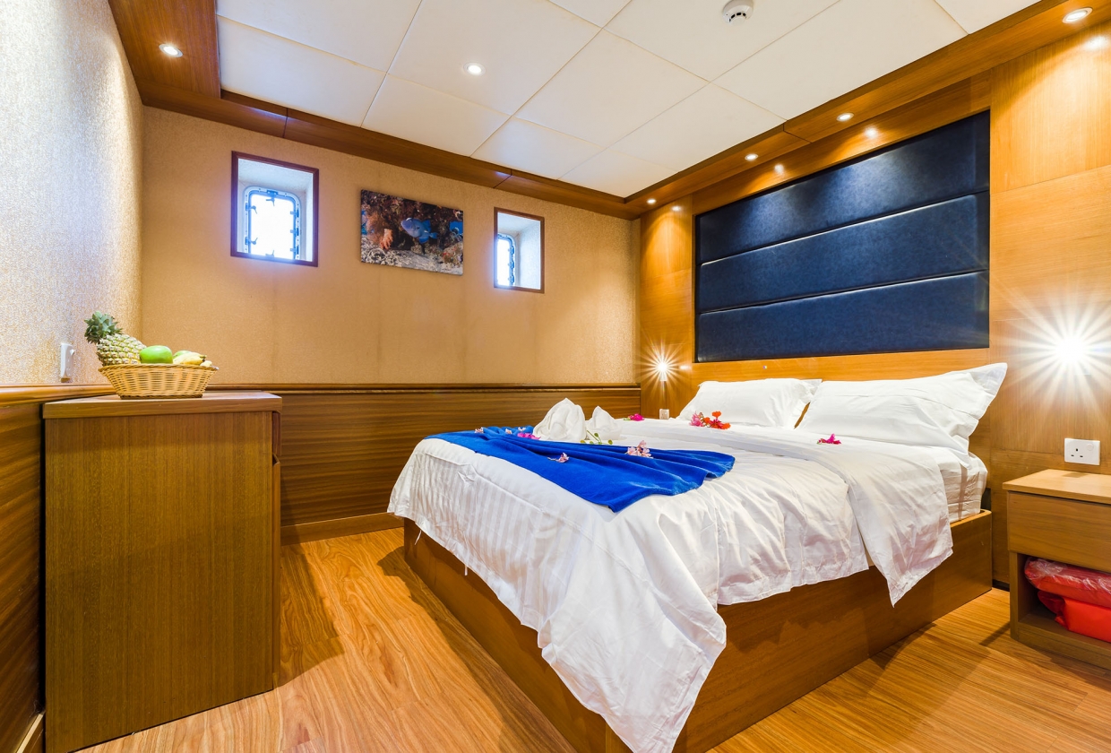 Seafari Explorer has 12 luxurious cabins and can accommodate up to 24 people. Six cabins are located on the lower deck, two of them have twin beds and the other four have one double bed and one single bed. The double bedrooms can be booked for double occupancy or can be shared. It is also suites perfect for family vacations. There are four double cabins on the upper deck. There other two twin cabins are located on the main deck. All cabins have a minibar, and large ensuite bathroom with shower, toilet and basin.